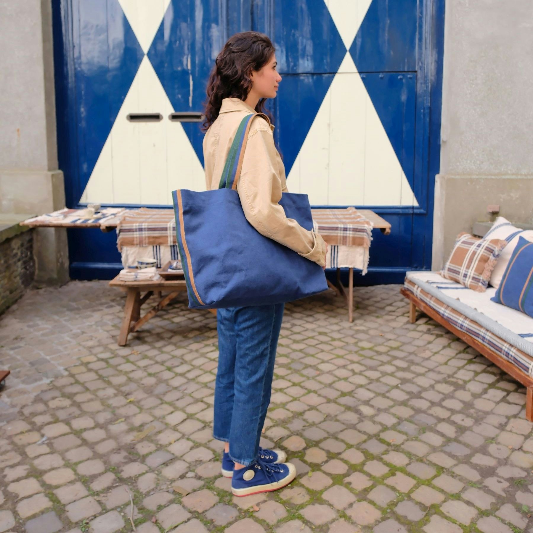 A shoulder bag in our Miles fabric, updated in a brand new indigo color and finished with a trim in racing green, ginger & indigo.
