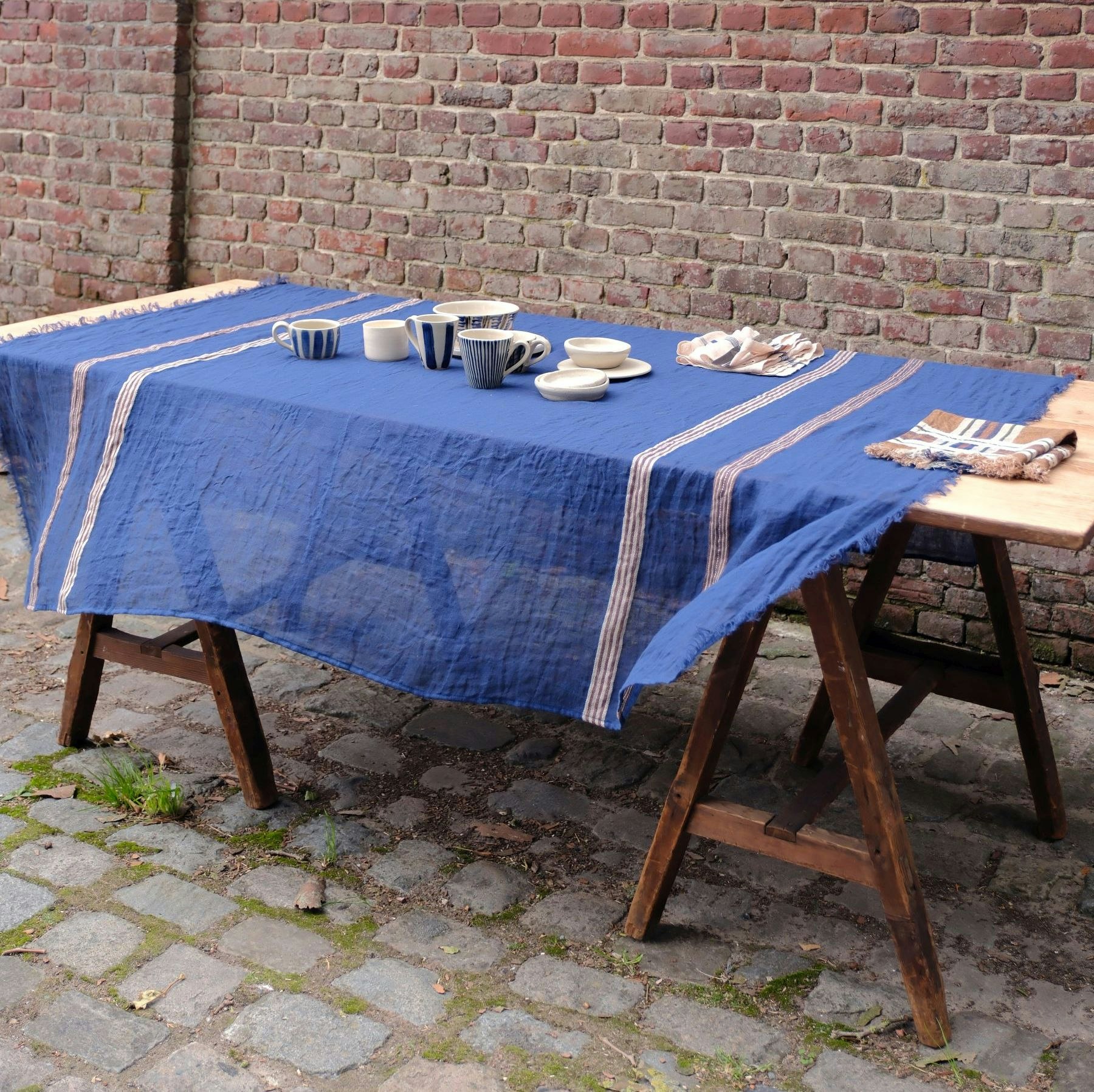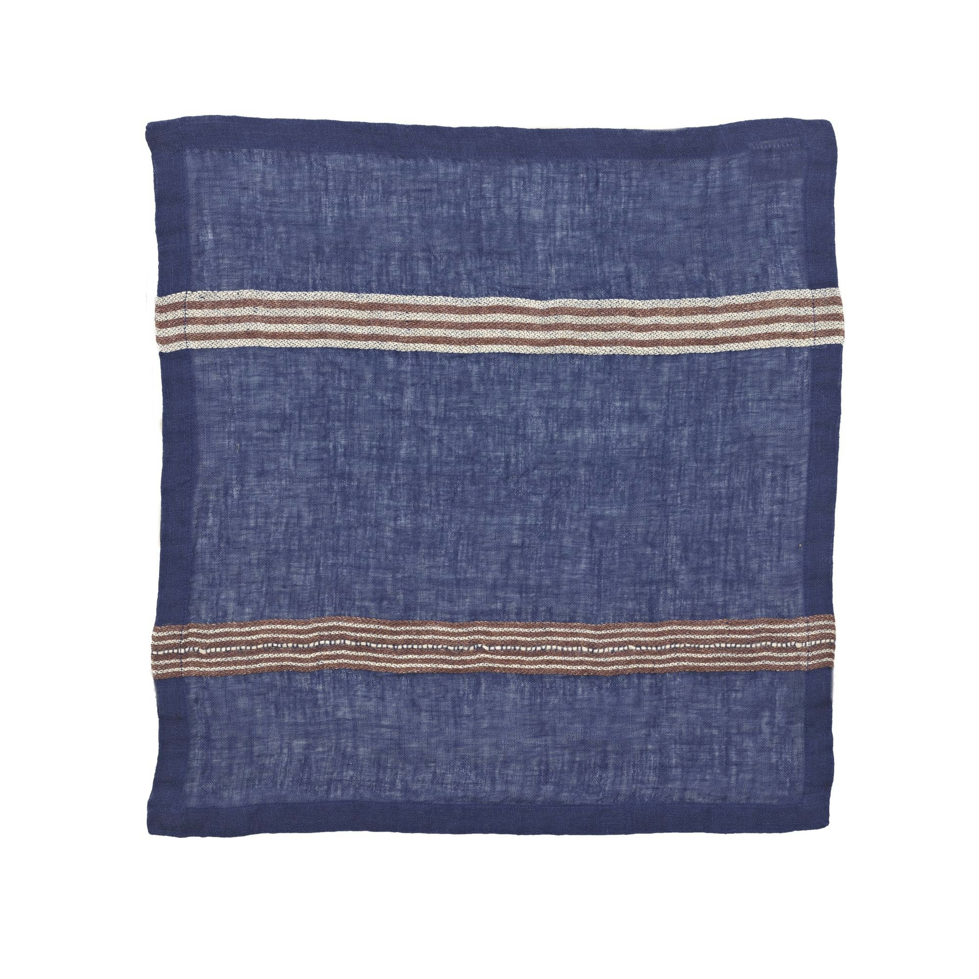 A napkin with an indigo ground and both a fine stripe and a bold stripe at each end in sienna-brown & off-white—graphic contrast with a warm, grounded tone.