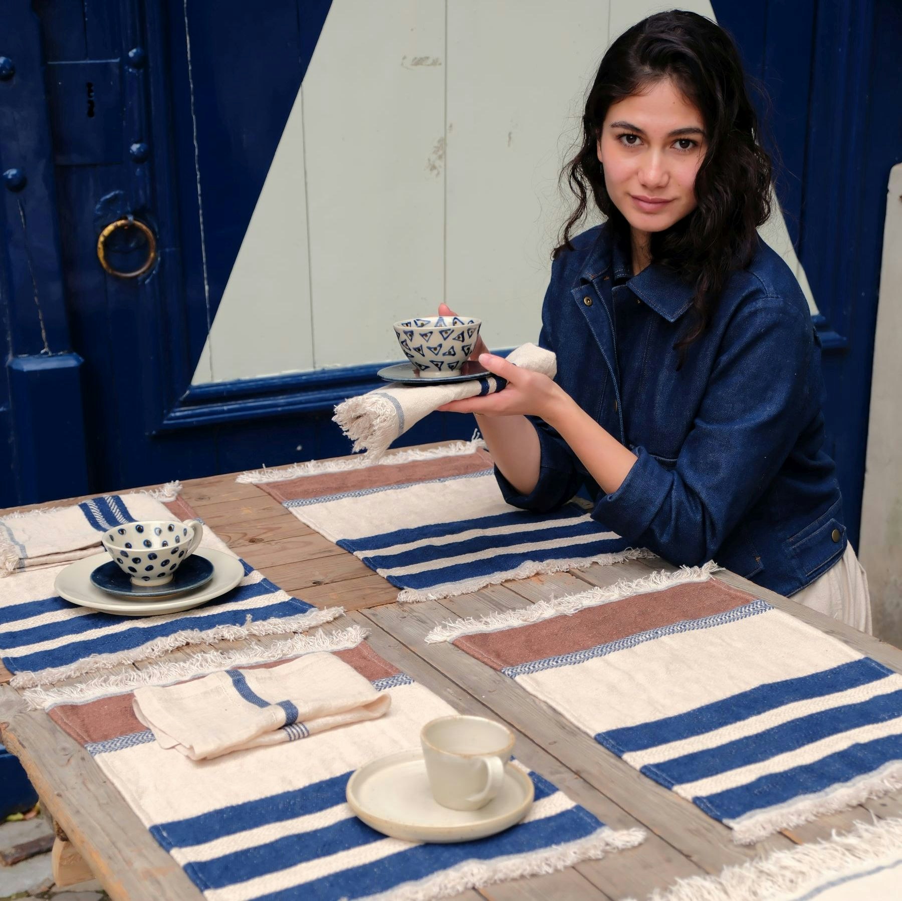 Sienna-bruine & indigostrepen aan één uiteinde en indigoblauw & off-white aan het andere, op een off-white achtergrond. De dichter geweven linnenkwaliteit geeft deze tafelset extra body en een luxueus gevoel.