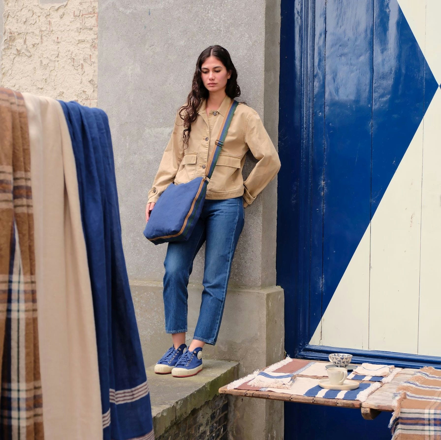 Onze Miles-stof in een nieuwe indigokleur, afgewerkt met een bies in racing green, gember en indigo. De cross body is compact en licht om te dragen, met een karaktervolle finish die meteen herkenbaar Libeco aanvoelt.