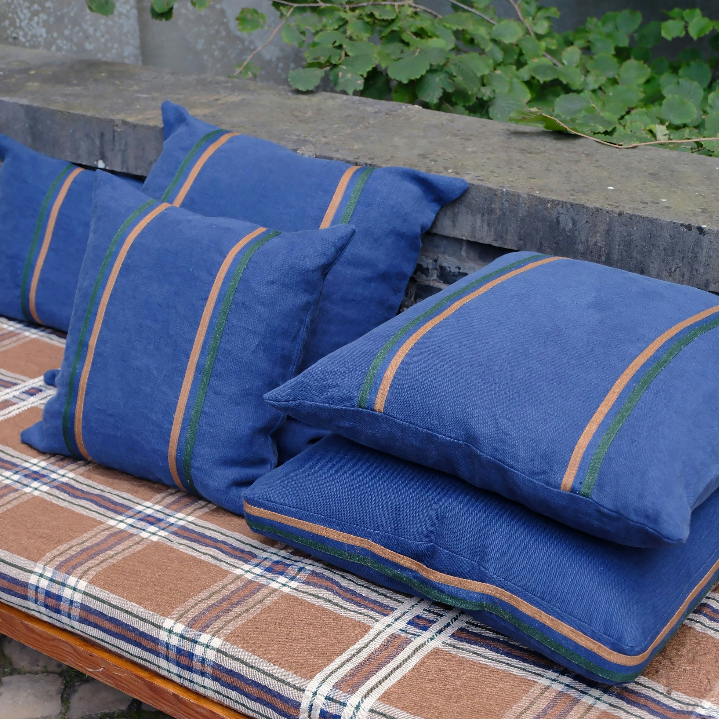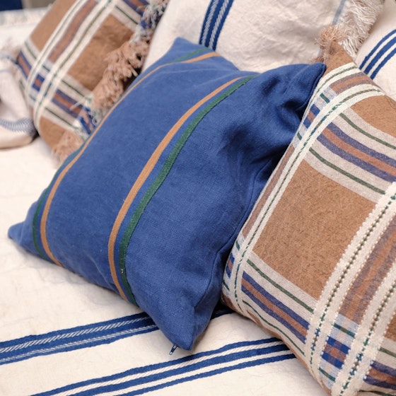 Onze Miles-stof in een nieuwe indigokleur, afgewerkt met een bies in racing green, gember en indigo. Op vraag van velen hebben we een All-rounder kussen toegevoegd dat iedereen mag claimen—van lounge-momenten tot een comfortabele plek voor je huisdier.