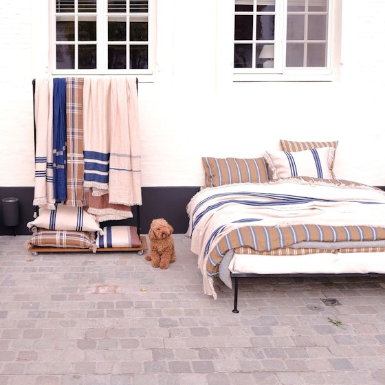Op een off-white ondergrond lopen indigo-blauwe strepen in een eenvoudige weefstructuur—rustig, maar met karakter.